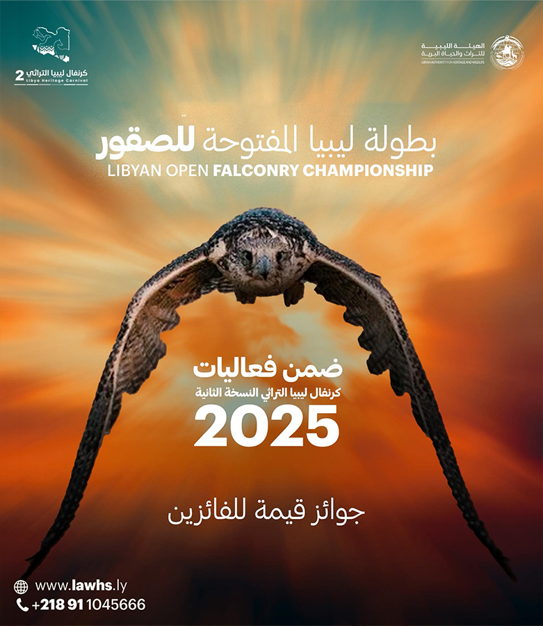 ستنطلق بطولة ليبيا المفتوحة للصقور 2025، ضمن فعاليات كرنفال ليبيا التراثي في نسخته الثانية بتنظيم الهيئة الليبية للتراث والحياة البرية وبرعاية كريمة من نائب القائد العام للقوات المسلحة الفريق أول صدام خليفة حفتر.